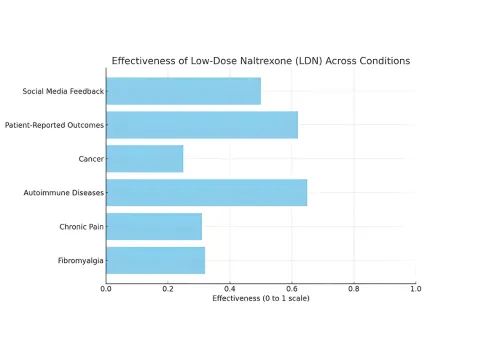 The chart displays the effectiveness of Low-Dose Naltrexone (LDN) across various medical conditions. It highlights that Autoimmune Diseases and Patient-Reported Outcomes show the highest effectiveness, while Cancer has the lowest. Social Media Feedback also indicates a notable impact, suggesting diverse perspectives on LDN's effectiveness among patients.
