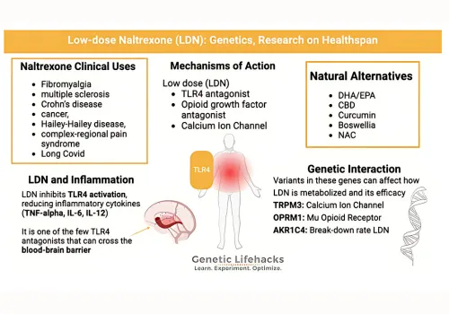 In conclusion, the exploration of Low-dose Naltrexone (LDN) reveals its potential as a versatile therapeutic option across various medical conditions, particularly in managing chronic pain, auto-immune and inflammatory diseases. Through its unique mechanisms of action, including TLR4 antagonism and modulation of endogenous opioid signalling, LDN has shown promise in treating ailments such as fibromyalgia and multiple sclerosis, among others. Although further research is essential to confirm its efficacy and optimal dosing regimens, current studies point to LDNs ability to enhance patient quality of life by reducing symptoms associated with these challenging conditions. The intricate interplay of LDN with genetic and metabolic factors, as illustrated above and supported by findings in (Androphy et al.) and (Cooper et al.), underscores the importance of a personalised approach in its application.